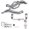 These BBK Performance full length exhaust headers and matching high flow catted mid pipe kits offer unsurpassed value, performance, quality, and fitment. Dyno tested and built right here in the USA our products outperform the competition hands down.Every long tube exhaust header system is built with CNC mandrel bent tubing for unrestrictive exhaust flow and maximum performance. All headers include 3/8" laser cut exhaust flanges, patented scavenging collector design and gasket less ball and socket connectors to easily connect the matching mid pipes.These performance exhaust kits have been designed specifically for your vehicles application to get the most horsepower and torque to the ground for maximum performance across the RPM range.All matching mid pipes included in our kits have high flow catalytic converters installed optimum sound and performance gains.All of these BBK kits are designed to replace the factory shorty style headers and factory mid pipe. Each BBK long tube header and matching mid pipe kit will bolt directly up to your cat back exhaust on your vehicle to complete the system to the tail pipe.Our decades of exhaust design and experience make BBK Performance the number one choice for your late model American car or truck.