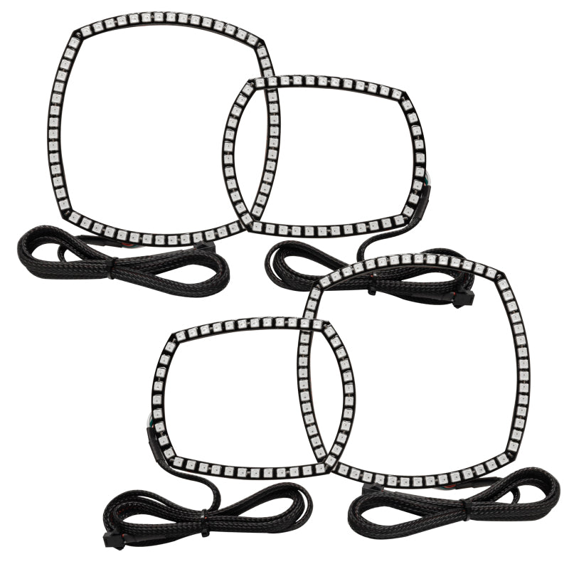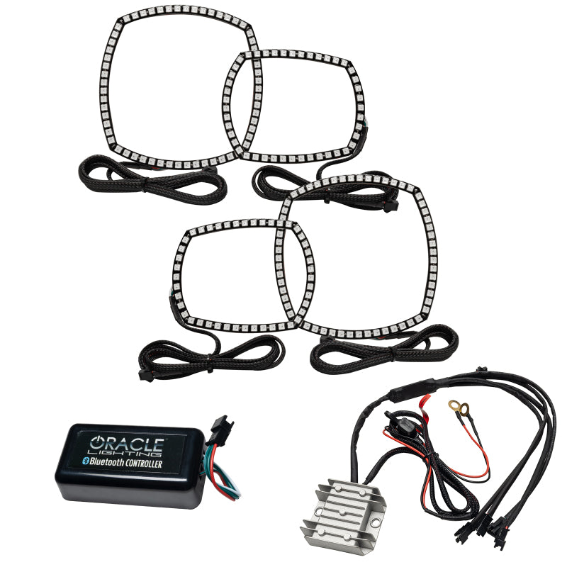 The new ORACLE Lighting Dynamic ColorSHIFT(tm) Halo Kit is the latest advancement in our expansive lighting modifications. The Dynamic features allow the user to run multiple moving color patterns through the Halo ring, creating a vivid eye-catching lighting effect. Conveniently controlled through a free smartphone App, the system features over 200 pre-programmed moving patterns as well as static color control and white mode for normal street driving. In addition to the pre-programmed features the user can also create custom designs through pixel editing in the app. New user-friendly design is a simple plug and play design making wiring easy for even a novice. Connect the ring terminals to the + and - battery terminals then control your lights from the smartphone app. Warranty lifetime period covers the LED and driver components. Hard part decay due to UV damage, oxidation, or environmental conditions are not covered under this stated period.