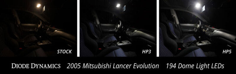 194 HP5 LED Features Diffused lens design for even spread Proven performance highly reliable Increased output with LED Appearance Plug and play simple installation Overview Design. The 194 HP5 LED bulb is a high-power LED in a small package. With copper inserts for heat dissipation the total output far exceeds the original bulb with a single diffused optic to spread light evenly. With its dual-lead contacts it will fit snugly in the socket as a direct plug-and-play replacement. Reliability. Unlike other bulbs on the market this bulb is built with constant-current circuitry along with transient suppression. That means this bulb will last for years not months with no flickering or failure. And like every Diode Dynamics product it's backed by an industry-leading three-year replacement warranty. Brightness. At 92 lumens the HP5 will provide about triple the total light compared to your original 5W 194 or 168 sized bulb. This is quite a lot of light especially if you have multiple bulbs installed. If you're not looking for something this bright we recommend its little brother the HP3. Colors. In addition to vibrant colors of blue red amber and green the 194 HP5 is available in a number of white color options. These include a cool white 6000K warm white 3000K a 5000K or pure white and a 4000K or natural white. Whether you want a modern cool white appearance or a traditional warm white color with more output we have the color to fit your need!