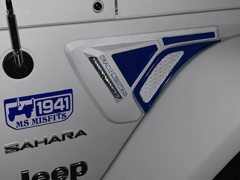 ORACLE Lightings new Sidetrack LED Lighting System is a stylish and functional upgrade for Jeep Wrangler JL and Jeep Gladiator models. This tactical-inspired body cladding is equipped with multi-function integrated LED lights that provide benefits to both driver and passengers. The light modules consist of a pair of injection-molded inserts that fit in the original body lines and contour the factory fender vent for a seamless look. Matte black panels provide an aggressive look that adds a rugged and tactical appearance to the Jeep. Installation requires no modification to the fender Sheetmetal, the cladding simply applies with included VHB adhesive.