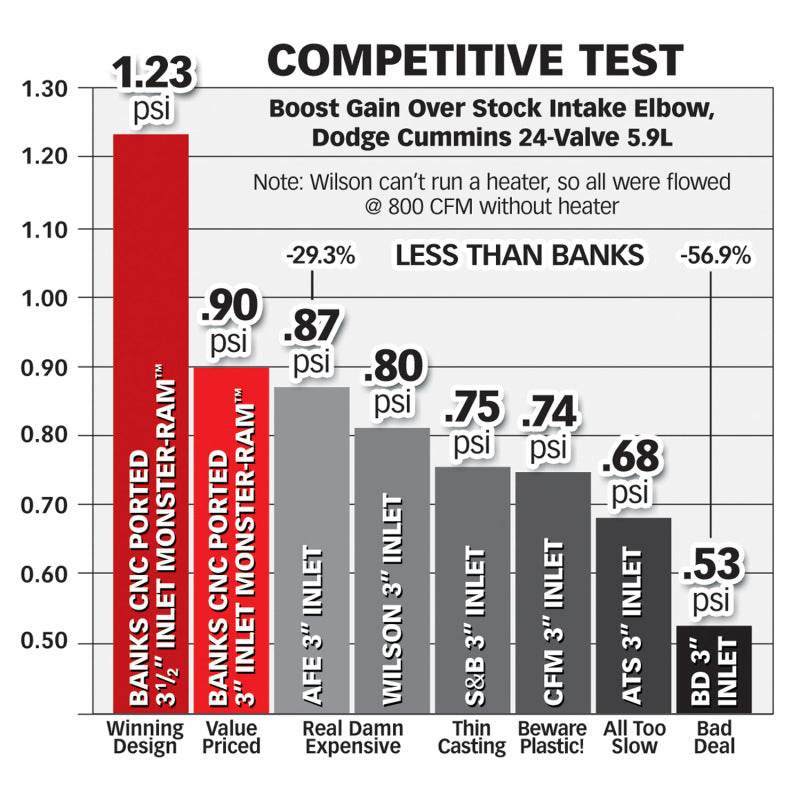 Monster-Ram raises boost without increasing backpressure at the turbine by Improving airflow from the intercooler. Result: a more responsive, fuel-efficient engine. Has six 1/8-inch NPT ports! Includes boost tube. The Banks Monster Ram is the highest performing Cummins Intake Elbow on the market, outflowing all competitors including our previous designs! Key Features: Delivers instant torque. Quicker throttle response. Improves airflow from the intercooler. Larger and less restrictive than stock intake. Raises boost without increasing turbine drive pressure. Uses OEM Boost Tube. Up to six 1/8-inch NPT ports. Out-boosts the competition by up to 56.9%. CNC port-matched for stock heater and Banks Billet Heater Delete. Optional 3.5-inch mandrel-bent boost tube