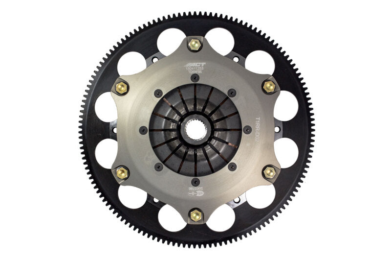 T1RR-D02 race, twin disc kits are race-ready for the serious enthusiast who needs a direct bolt-in kit, requiring no additional modifications. ACT's sintered iron race discs offer the highest torque capacity of all ACT race discs and have ultra-high heat capacity. Most kits offer pedal loads 10-20% higher than stock, yet increasing the clamp load by 80-90%. All ACT twin disc kits include a CNC-machined and dynamically balanced flywheel for trouble free use. All kits undergo an exclusive four-stage, heat-treating process on all diaphragms. ACT twin disc kits include a pressure plate, two discs, floater, flywheel and alignment tool. Some kits may include a pilot bearing and release bearing. ACT Twin disc kits meet SFI Specification 1.2.