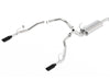 Converts vehicles with factory single exhaust to dual exhaust. Fits underneath the factory bumper. This 3" diameter into dual 2.5" Cat-Back™ system features the classic S-type sound with no drone inside the vehicle and exits thru single 4" round black chrome on T-304 stainless steel tips. Using BORLA® Stainless Steel Polish p# 21461 is NOT recommended with these black chrome tips. We suggest cleaning the tips with hot water and a microfiber cloth. A system with bright chrome onT-304 stainless steel tips is also available. BORLA® Cat-Back™ and Axle-Back exhaust systems feature patented straight-through and multi-core technology designed to unleash hidden horsepower. Increased exhaust velocity adds power, driving excitement, fuel economy, and the distinctive BORLA® Sound of Power respected by motoring enthusiasts everywhere. Each system is built from premium, high-quality austenitic T-304 stainless steel, superior to T-400 series knockoffs (such as 409), to give you the absolute best in performance and durability. Ultra-smooth mandrel bends ensure maximum flow & power, and precision computer numerical control (CNC) manufacturing ensures an accurate fit. Best of all, BORLA® stands behind every system with a Million-Mile Warranty. Just what you'd expect from the world's most experienced (and most winning) exhaust brand.