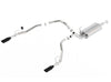 Fits through the factory bumper cut-outs (bumper has notches on the bottom). This 3" diameter into dual 2.5" Cat-Back™ system features the mellow Touring sound with no drone inside the vehicle and exits thru single 5" round black chrome on T-304 stainless steel tips. Using BORLA® Stainless Steel Polish p# 21461 is NOT recommended with these black chrome tips. We suggest cleaning the tips with hot water and a microfiber cloth. A system with bright chrome on T-304 stainless steel tips is also available. BORLA® Cat-Back™ and Axle-Back exhaust systems feature patented straight-through and multi-core technology designed to unleash hidden horsepower. Increased exhaust velocity adds power, driving excitement, fuel economy, and the distinctive BORLA® Sound of Power respected by motoring enthusiasts everywhere. Each system is built from premium, high quality austenitic T-304 stainless steel, superior to T-400 series knockoffs (such as 409), to give you the absolute best in performance and durability. Ultra-smooth mandrel bends ensure maximum flow & power, and precision computer numerical control (CNC) manufacturing ensures an accurate fit. Best of all, BORLA® stands behind every system with a Million-Mile Warranty. Just what you'd expect from the world's most experienced (and most winning) exhaust brand.