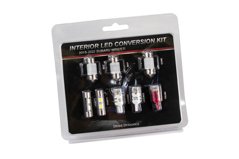 Features Includes all the LEDs you need to replace the interior incandescent bulbs Increased output with LED appearance Plug-and-play, simple installation Available in multiple colors and brightness levels. Overview Upgrade. This Interior LED Bulb Pack is compatible with the Subaru WRX STi and gives your vehicle a more modern appearance. this pack includes all the LEDs you need to replace the factory vanity, map, trunk, dome, and license plate incandescent bulbs. These bright LEDs are available in a number of colors including cool white, red, and blue, to match your unique style. Brightness. this pack is available in two different brightness levels. The Stage 1 option is a good choice if you're looking for a simple change of color, and slightly brighter output than your factory bulbs. For the highest increase in light output from your factory bulbs, we'd recommend the Stage 2 option! All Diode Dynamics LED lighting is rated with accurate, measured lumen figures, not calculations or guesses. We test the true output in-house, and provide you the real numbers to compare. Reliability. Unlike other bulbs on the market, Diode Dynamics LEDs are built with constant-current inductive circuitry, along with transient suppression. While more expensive than simple bulbs, this allows Diode Dynamics LEDs to last for years, with no flickering or failure. What's Included Two (2) 28mm Red Vanity Bulbs Two (2) 31mm Red Map Light Bulbs Two (2) 194 Cool White License Bulbs One (1) 194 Red Trunk Bulb One (1) 31mm Red Dome Bulb Installation Guide