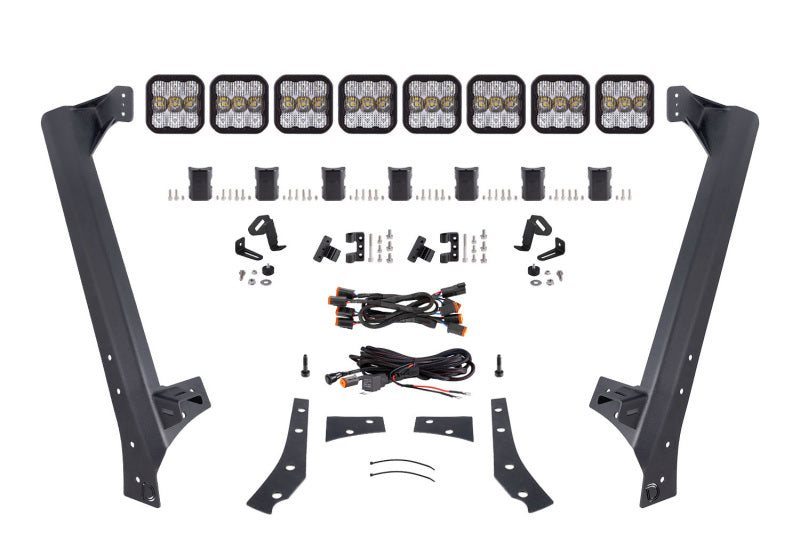 Features Bolt-on fitment compatible with Jeep JK Wrangler 2007-2018 Ultra-high intensity, with custom-engineered TIR optics Selectable backlight color, with eight color options Torture-tested, heavy-duty construction Control through factory aux switch bank using the included harness Assembled in USA Overview Perfect Fitment. The Windshield CrossLink Lightbar Kit compatible with Jeep JK Wrangler 2007-2018 from Diode Dynamics allows you to mount eight linked SS5 LED pods above the factory windshield. These application-specific brackets were CAD-designed to bolt into place using factory mounting points above the factory windshield. No cutting or drilling required! Designed for Performance. Featuring the highest output intensity of any 5-inch LED pod on the market, these lamps have been designed for maximum functionality, with patented technology and custom-engineered TIR optics, all in a durable package. Selectable Backlight. The SS5 LED Pods included in the White kit feature a selectable backlight with eight different color options, perfect for extra styling, or for more visibility when you’re not using the main beam. Selecting your backlight color is easy - simply alternate the power on and off. There’s no complicated programming with a controller! The SS5's backlight fully illuminates the TIR optic, providing unique accent lighting that you won't find on other LED pods. NOTE: Due to the yellow lens, the Yellow kit is only available with an Amber backlight. CrossLink. Our patent-pending CrossLink technology allows you to link up to eight SS5 pods together to create your own lightbar. The single-piece CNC aluminum link provides extreme rigidity, but is fully adjustable, for both straight and curved configurations.