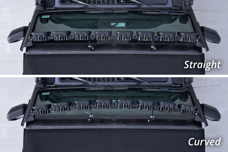 Features Bolt-on fitment compatible with Jeep JL Wrangler 2018-2021 Ultra-high intensity, with custom-engineered TIR optics Selectable backlight color, with eight color options Torture-tested, heavy-duty construction Control through factory aux switch bank using the included harness Assembled in USA Overview Perfect Fitment. The Windshield CrossLink Lightbar Kit compatible with Jeep JL Wrangler 2018-2021 from Diode Dynamics allows you to mount eight linked SS5 LED pods above the factory windshield. These application-specific brackets were CAD-designed to bolt into place using factory mounting points above the factory windshield. No cutting or drilling required! Designed for Performance. Featuring the highest output intensity of any 5-inch LED pod on the market, these lamps have been designed for maximum functionality, with patented technology and custom-engineered TIR optics, all in a durable package. Selectable Backlight. The SS5 LED Pods included in the White kit feature a selectable backlight with eight different color options, perfect for extra styling, or for more visibility when you’re not using the main beam. Selecting your backlight color is easy - simply alternate the power on and off. There’s no complicated programming with a controller! The SS5's backlight fully illuminates the TIR optic, providing unique accent lighting that you won't find on other LED pods. NOTE: Due to the yellow lens, the Yellow kit is only available with an Amber backlight. CrossLink. Our patent-pending CrossLink technology allows you to link up to eight SS5 pods together to create your own lightbar. The single-piece CNC aluminum link provides extreme rigidity, but is fully adjustable, for both straight and curved configurations.