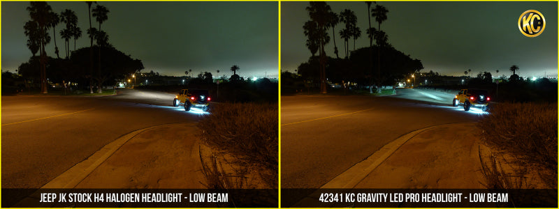 FEATURES-Gravity LED Pro 7" Headlights-Patented Gravity Projector Optics(GPO)-Hard Coated Polycarbonate Lens-Precision Die-Cast Aluminum Housing-DOT Compliant Low and High Beam with built-in Daytime Running Light-KC Engineered Polished Reflector Optics-Plug-n-Play for Jeep JK-***Note: Does not fit 17-18 Jeep JK Rubicon/Sahara editions or Jeeps equipped with factory LED headlightsLIGHT PERFORMANCE(PER LIGHT)-Raw Lumens: Low- 2,967 lm, High- 2,575 lm, DRL- 386 lm-Lux @ 10 Meters: Low- 400 lx, High- 700 lx?-Candela: Low- 40,000 cd, High- 70,000 cd-Beam Distance: Low- 400m, High- 529mSPECIFICATIONS(PER LIGHT)-Wattage: Low- 18W, High- 25W-LED Bulb: CREE: XPL/XPG2-Color Temp: 5000K-Amp Draw: 1.88A-Voltage: 9V-18V-IP Rating: IP68-Product Dimensions: W - 6.96" x D - 5.098"Gravity EXTREME OUTPUT AND EFFICIENCYThe Gravity LED Pro 7" headlight uses KC's patented Gravity Projector Optic (GPO). Utilizing this proprietary projector lens technology along with a GRD LED core, KC engineers were able to deliver a more controlled beam pattern while setting new industry standards in light shape, clarity and output. HIGH-PERFORMANCE REFLECTOR OPTICSThe Gravity LED Pro 7" Headlight features KC's patented Gravity GRD technology, which is engineered to direct every lumen from powerful LEDs into usable light output.HIGH/LOW/DRL FUNCTIONHigh/Low beams as well as DRL functionality come installed in this KC projector headlight to greatly improve visibility and clarity over factory Jeep headlights.DESIGNED FOR DURABILITYThe Gravity LED Pro 7" Headlight uses a durable die-cast housing and Polycarbonate lens, to tolerate the harshest climates and conditions.