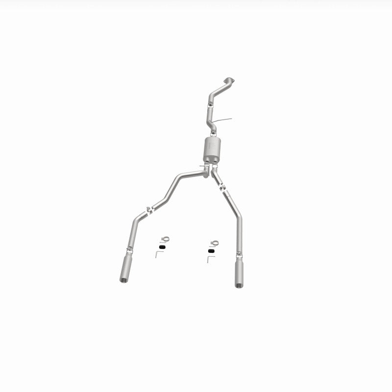 The MagnaFlow Street Series Cat-Back Performance Exhaust System 15754 brings out the personality of your Truck with our signature resonant, powerful engine tone and dyno-proven performance. Thanks to its fast-flowing, mandrel bent 3in. main piping and 1 Straight-Through mufflers ending in a Dual Split Rear exit with 3.5in. Polished Clamp-On Single Wall Angle Cut Rolled Edge tips, this Truck exhaust kit has the performance chops to match its sporty sound and appearance. Upgrade your ride to the next level with an exhaust that has the pipes to put other Truck's to shame. With this system your vehicle will be producing Aggressive exterior and Moderate interior sound levels while leaving other cars and trucks feeling envious at every stoplight. Exhaust kit 15754 features a cat-back layout that replaces your ride's stock exhaust components from near the catalytic converter on back. Extensive 3D scanning during development has resulted in a direct-fit design that you can easily install yourself. 15754 is produced using CNC precision robotic manufacturing techniques and is backed by MagnaFlow's 1-year limited finish warranty and limited lifetime construction warranty.