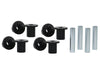 All in one leaf spring bushing service kit covering front and rear eyes of the leaf plus shackle bushings. High kilometres and heavy load carrying causes excessive wear on rubber bushings. Whiteline's signature black bushings are made tough and offer outstanding abrasion resistance, high load bearing capability (4WD's, utes and towing), flexibility, increased tensile strength and chemical resistance to oil, grease, ozone and weathering.