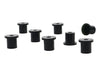 A critical service item for any leaf sprung vehicle. High kilometres and heavy load carrying causes excessive wear on rubber bushings. Whiteline's signature black bushings are made tough and offer outstanding abrasion resistance, high load bearing capability (4WD's, utes and towing), flexibility, increased tensile strength and chemical resistance to oil, grease, ozone and weathering.